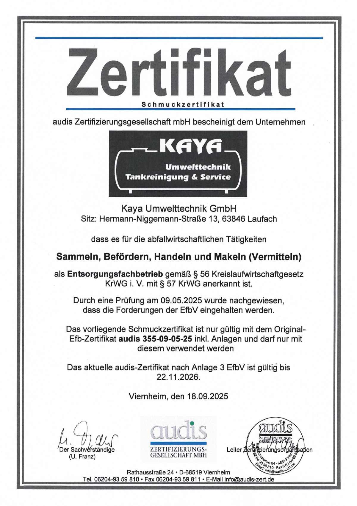 Beleg dafür ist die Fachbetriebszulassung nach § 19 I WHG, für Tankanlagen aller Gefahrenklassen, sowie die Zertifizierung als Entsorgungsfachbetrieb nach Kreislaufwirtschafts- und Abfallgesetz.